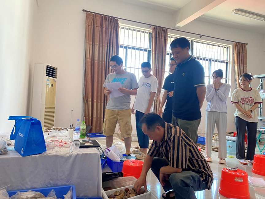 6月10日下午,调研组一行先到隆安娅怀洞遗址整理现场进行调研。科学技术史及文物与博物馆专业4名硕士研究生已于月初派往隆安娅怀洞遗址整理现场进行石制品整理工作,研究生们在导师指导下,对娅怀洞遗址进行年代学和地层学的整理工作。容志毅教授与李大伟教授与同学们就不同石器分类标准,以及石器用途展开了热烈讨论;任晓磊老师对娅怀洞遗址整理方法和保存情况等与同学们进行深入交流;程煜祯老师了解了同学们实践学习的生活环境,叮嘱同学们实践学习中注意安全等问题。