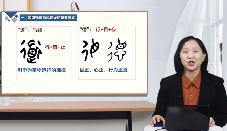 课程分三小节进行,分别论述了加强师德师风建设的重要意义、习近平总书记关于教师的相关论述、师德师风建设的几个重要着力点。课程之始,石教授首先对“德”字的字形结构、历史演变入手,讲述古代中国对“德”字的理解。
