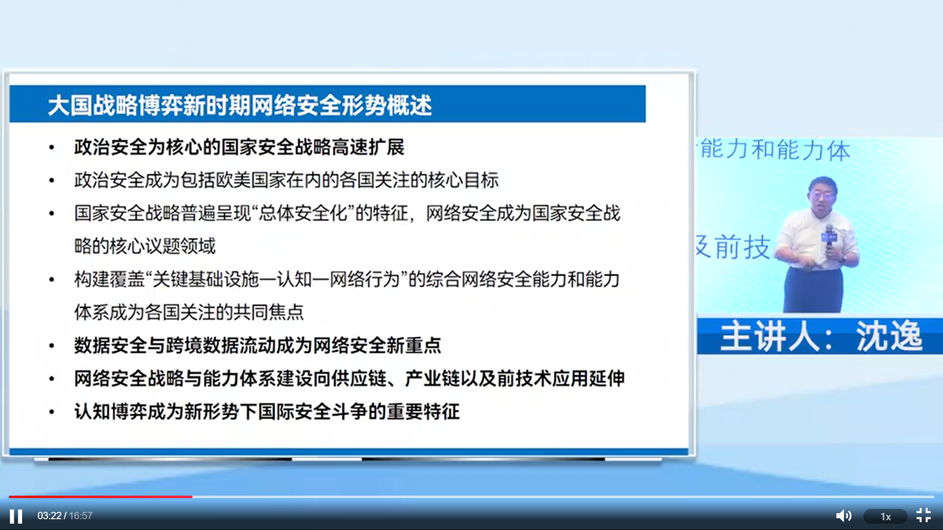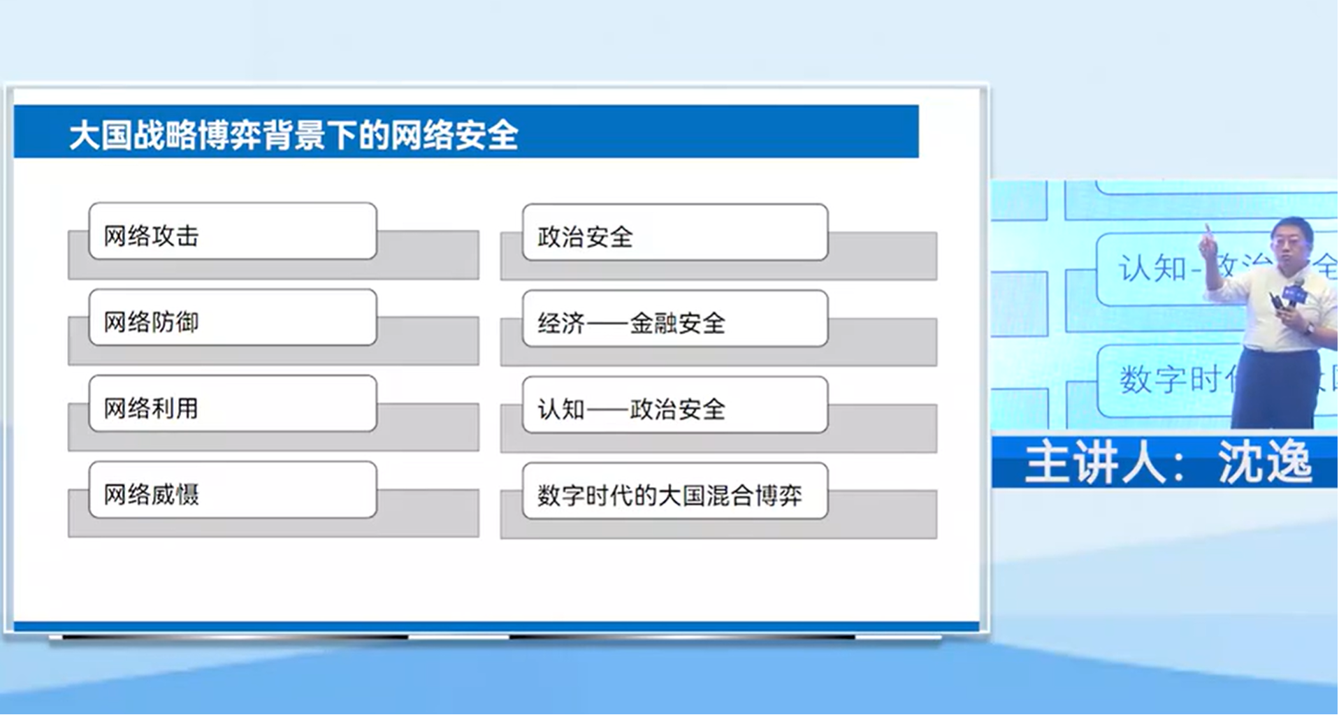 课程分三部分讲述进行,课程之始,沈逸教授就着重指出目前随着全球化的深入发展,网络安全已成为国家安全的重要组成部分。当前全球正处在一个动荡变革的时期,网络安全形势日趋复杂。沈逸教授对全球网络安全形势进行了宏观描述。他指出,随着信息技术的快速发展,网络空间已成为国家间竞争的新战场。各国在网络技术、网络治理、网络攻防等方面展开了激烈的竞争。同时,网络犯罪、网络恐怖主义等非传统安全威胁也日益突出,对全球网络安全构成了严重挑战。在中美战略博弈的背景下,沈逸教授详细分析了中美在网络安全领域的竞争现状。他强调,中美两国作为全球网络技术的主要推动者,其战略博弈对全球网络安全格局产生了深远影响。最后沈逸教授展望了中美在网络安全领域的合作与竞争前景,指出两国在维护网络空间和平稳定方面拥有共同利益,但也存在分歧和竞争。