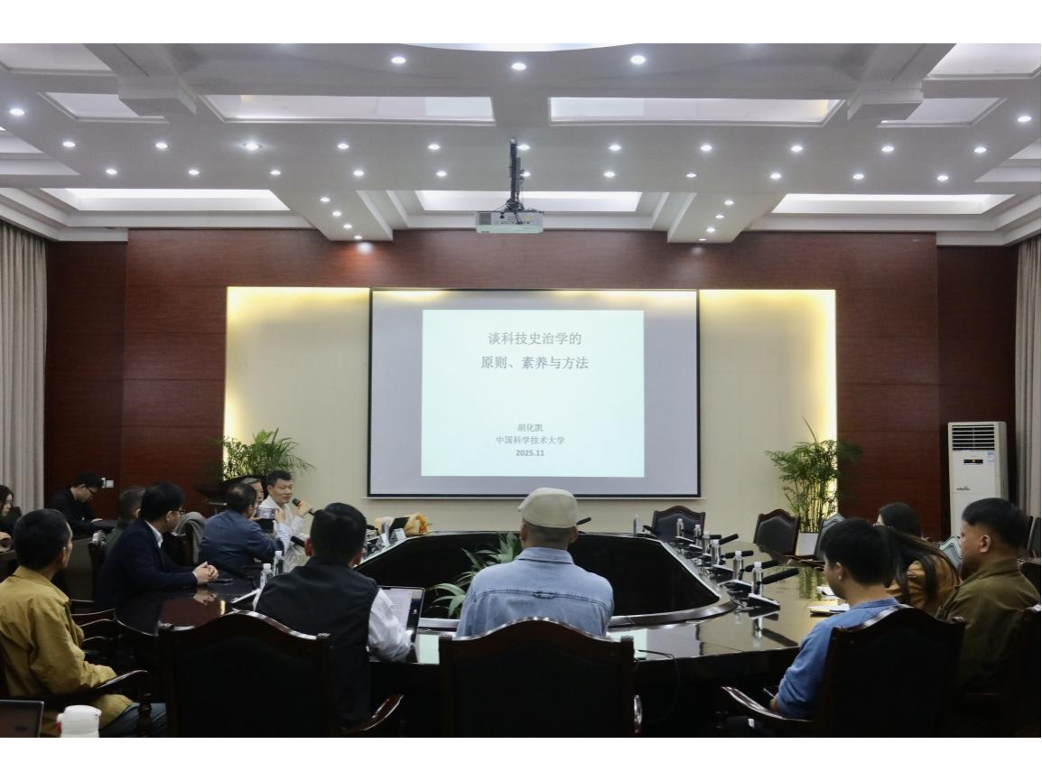 2025年11月11日,“谈科技史治学的原则、素养与方法”学术讲座在国交楼会议室举办。本次讲座邀请中国科学技术大学教授胡化凯担任主讲,研究院汪常明教授主持。