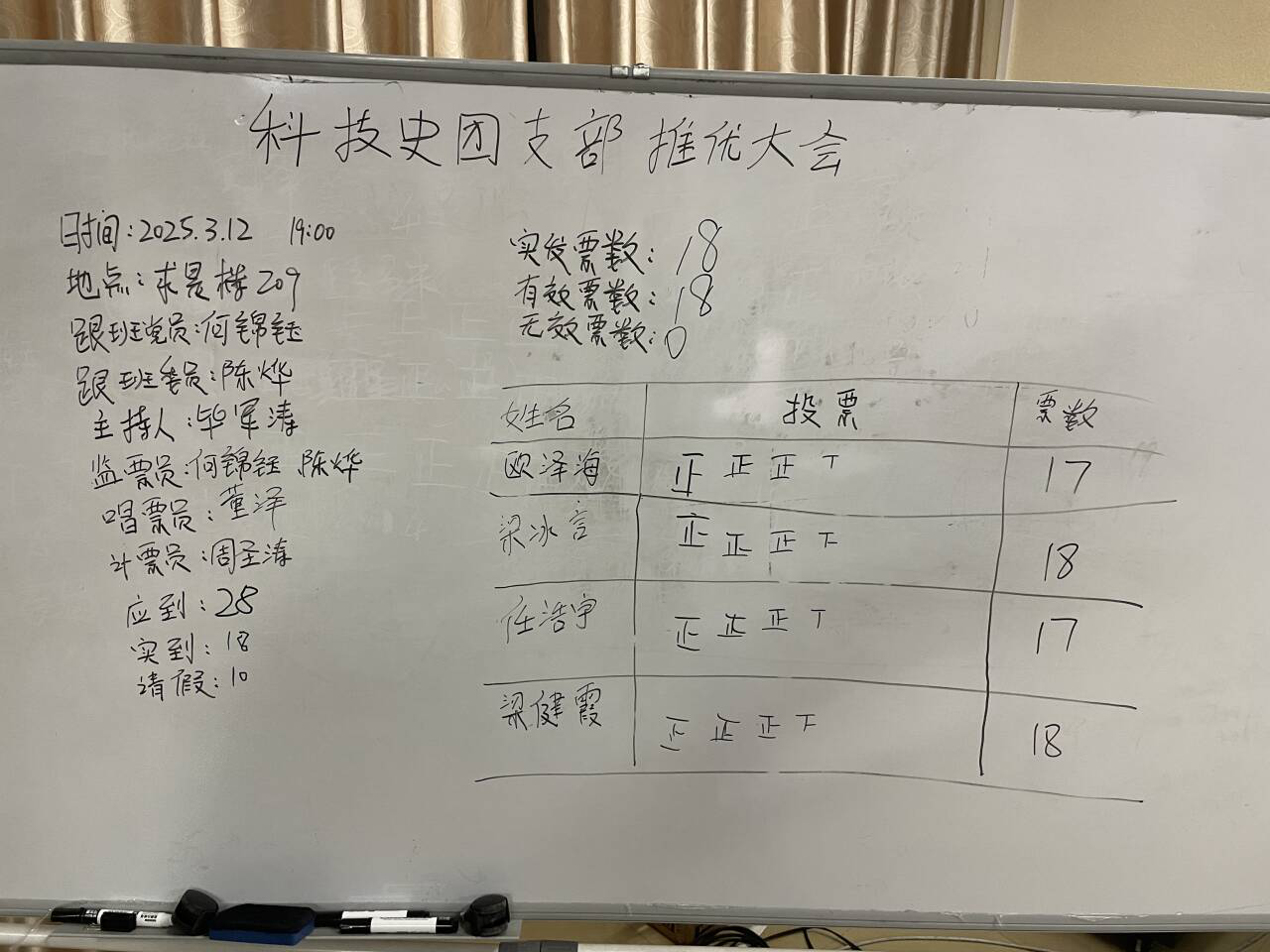 为贯彻落实党组织关于党员发展工作的要求,加强党建带团建,团建促党建工作,科技史团支部于2025年3月12日晚上七点在求是楼209小会议室举行入党积极分子推优会议,科技史党支部组织委员曾仙赐老师和科技史学生党员、团员出席推优大会。会议由23级团支书毕军涛主持,本次会议应到28人,实到18人。团支部有四位推优候选人参加本次竞选,最后共有四位同学当选入党积极分子。